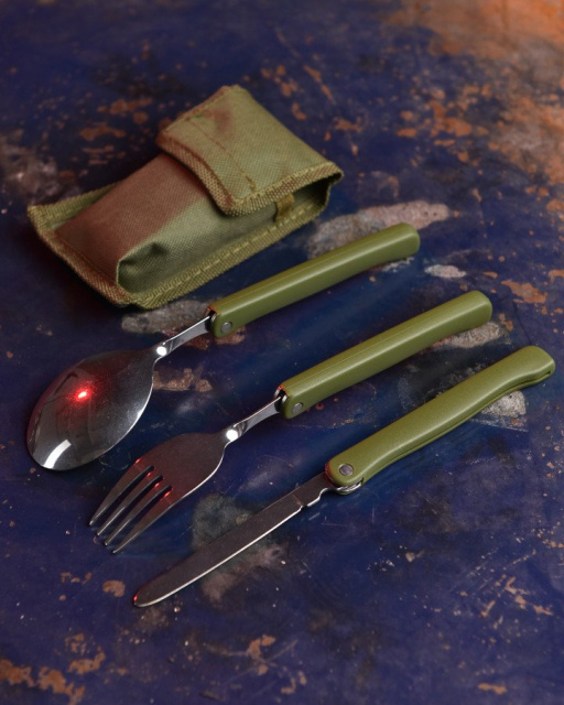 Набір включає складні ніж, вилку і ложку, чохол. Столові прилади виготовлені із нержавіючої сталі. Матеріал не вбирає запахи, простий у неокислюваному догляді, має гарні гігієнічні показники. Підходить для миття у посудомийній машині. Ручка виготовлена із нешкідливого харчового пластику. Комфортно лежить у руці, не вислизає під час роботи.